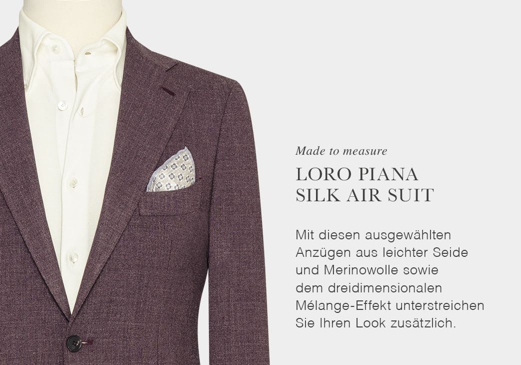 Wenn Luxus auf Komfort trifft, entstehen diese leicht verstärkten Anzüge von Loro Piana. Die in dunkles Rotbraun getauchte, mit Seide versetzte Merinowollmischung erzeugt einen dreidimensionalen Mélange-Effekt und sorgt für einen zusätzlichen Blickfang