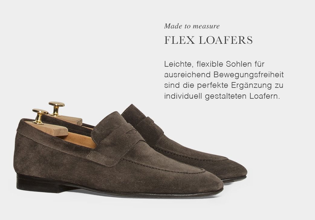 Unsere Flex Loafers verbinden gekonnt Komfort mit Flair und passen damit perfekt zu entspannten Outfits mit dem gewissen Etwas. Sie können mit jedem unsere Sneaker-Leder oder -Wildleder individuell gestaltet werden. Die Konstruktion fußt auf dem Bologna-Modell, das sich durch eine unglaublich flexible Sohle auszeichnet. Daraus ergibt sich ein leichter Schuh für Bewegungsfreiheit und Mobilität.