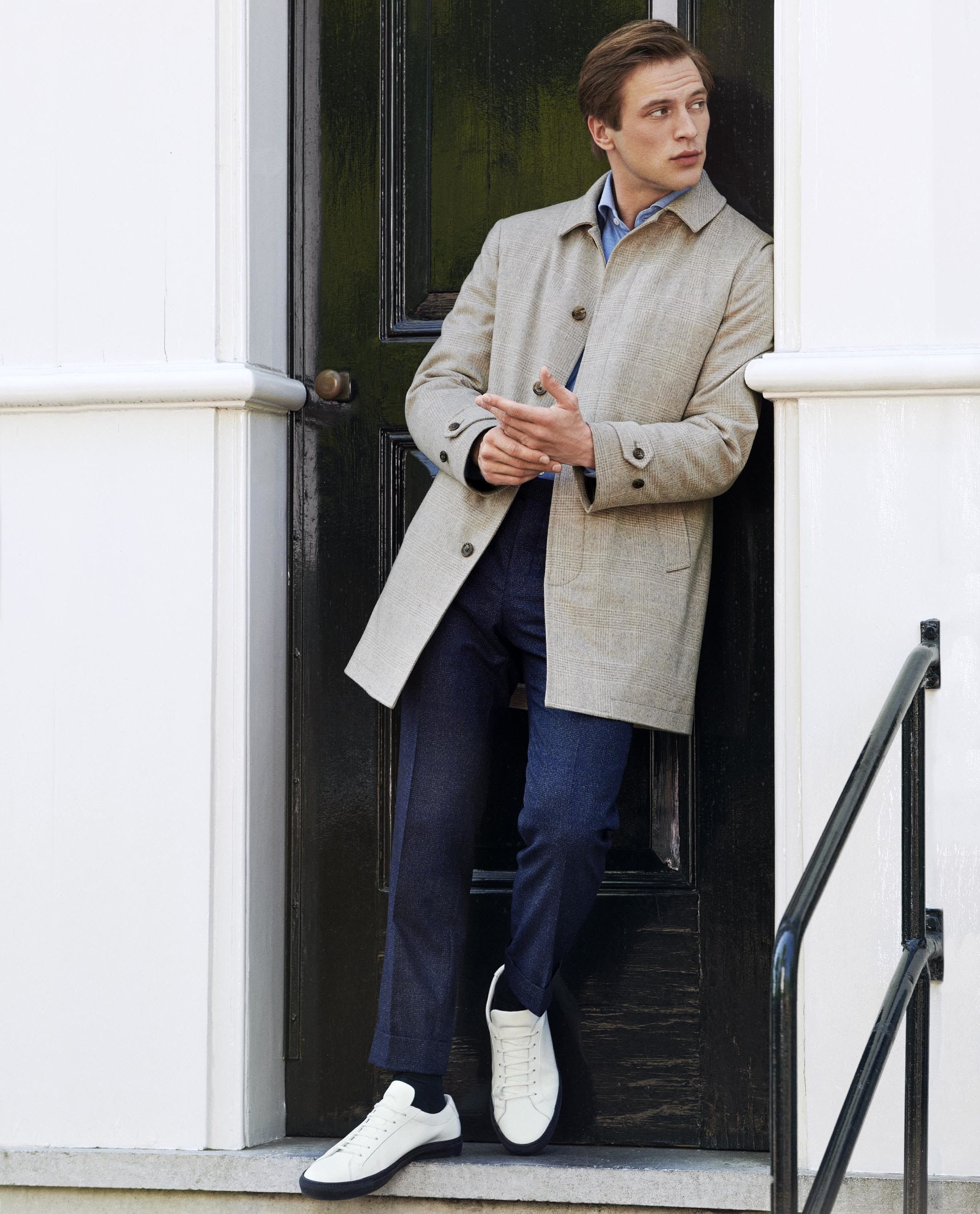 Der Rest ist leicht und unterhaltsam. Etwas Weiches und Atmungsaktives darunter, wie ein melangefarbener Piqué-Strick in Hellblau. Für Schuhe: frische weiße Low-Top-Sneakers. Das feine Kalbsleder aus Italien ist pflanzlich gegerbt und natürlich glatt. Fügen Sie eine kontrastierende Sohle für den denkwürdigsten Stil hinzu.