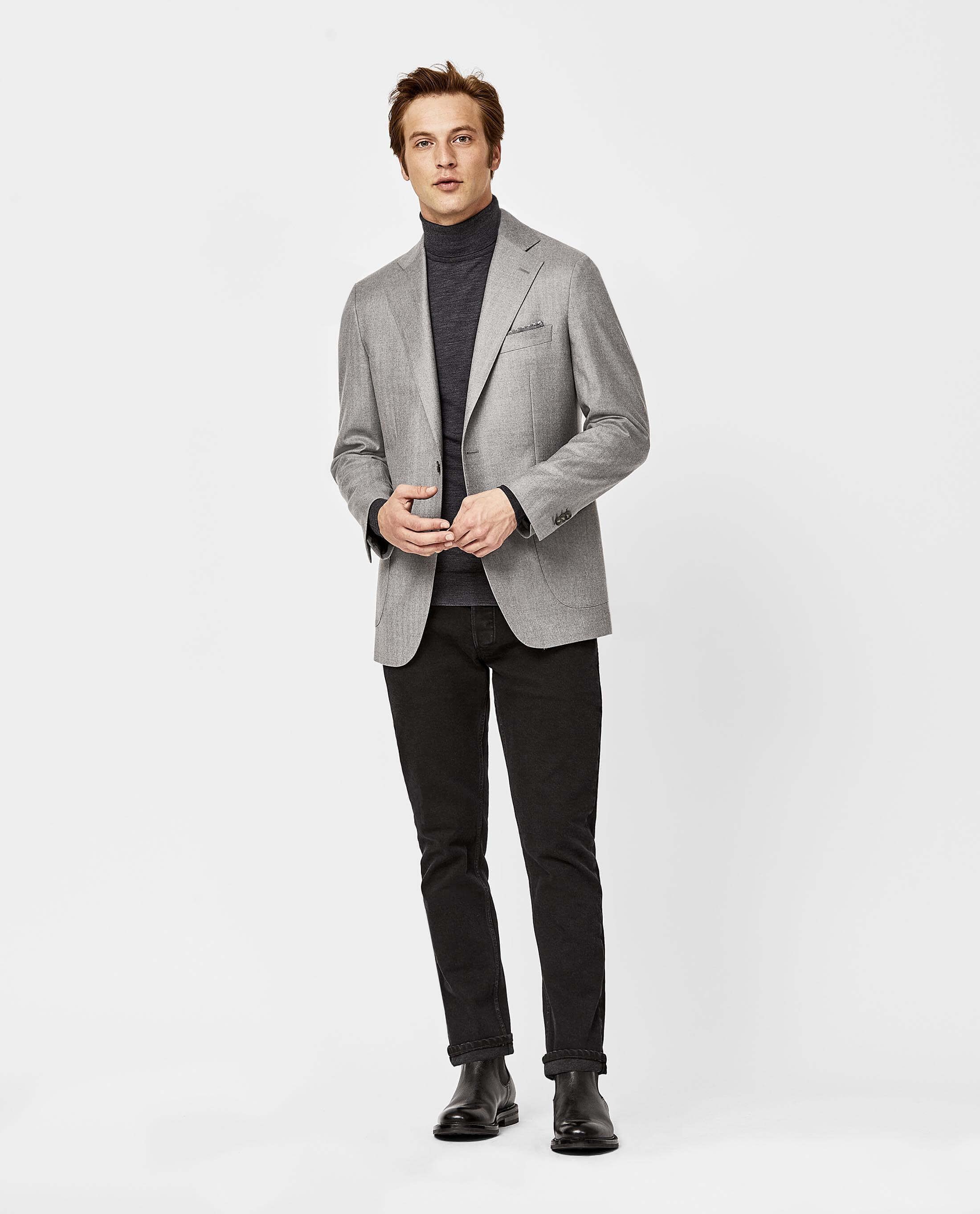 08. Dezember 2020Ein look der die kalten Temperaturen und den bewölkten Himmel ergänzt. Hier mischen wir warme und funktionelle Stücke für einen lässigen Freizeistil. Die Jacke ist aus steingrauer Flanell, der aus luxuriöser Super-140-Wolle gewebt ist. Sie ist strapazierfähig und bequem und die ideale Wahl für Freizeitkleidung. Ziehen Sie einfach eine unserer Merinowolle-Strickwaren darunter an, und schon können Sie loslegen.