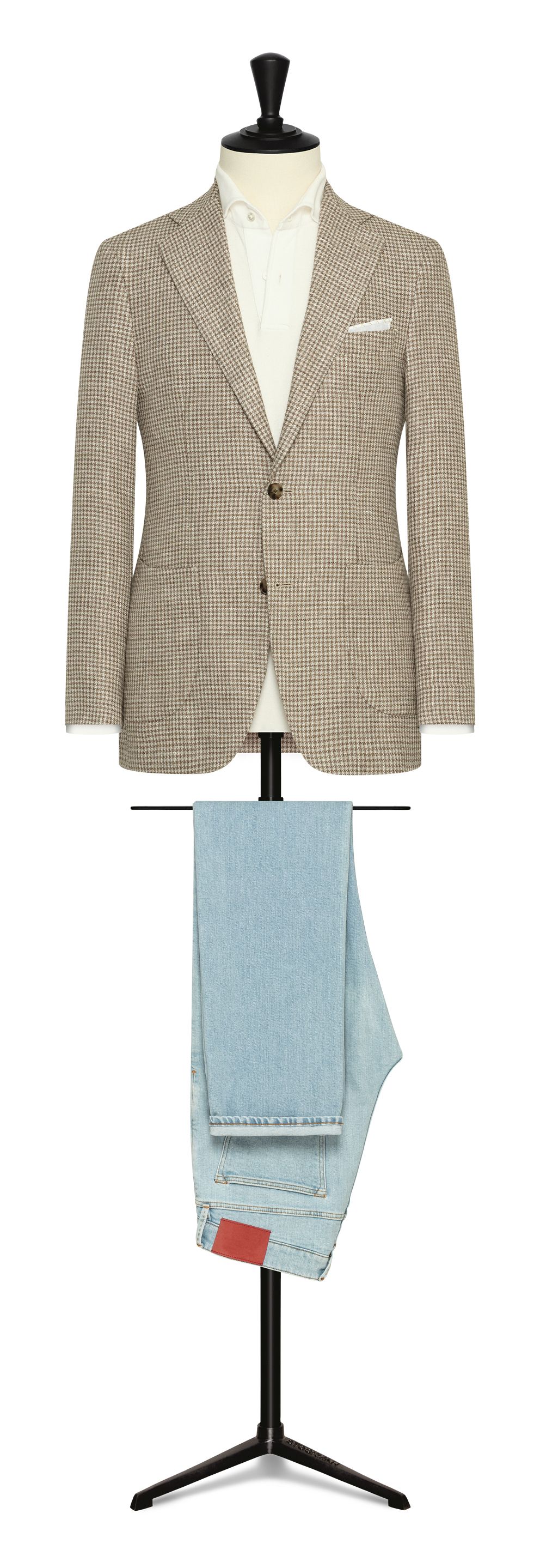 Light and airy, this summer-approved mix of linen and wool by Drago will have you set for the season. The beige and cinnamon houndstooth woven in Italy features a slight shine and pairs well with light colored chinos and denims. A refined jacket for those looking to master the casual neutral look.