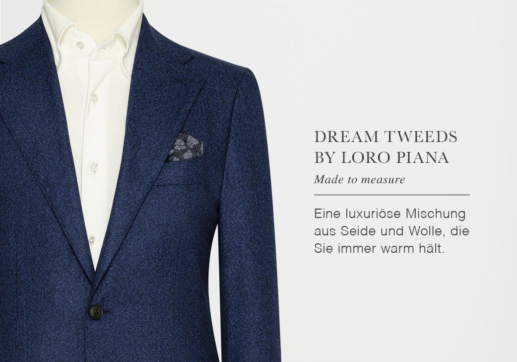 Eine einzigartige Mischung aus strukturierter Wolle und luftiger Weichheit: Unsere Dream-Tweed-Auswahl trotzt den winterlichen Elementen und umgibt den Träger zugleich mit Wärme und raffinierter Eleganz. Zudem passt sie perfekt zu unseren ausgefallenen Futterstoffen.