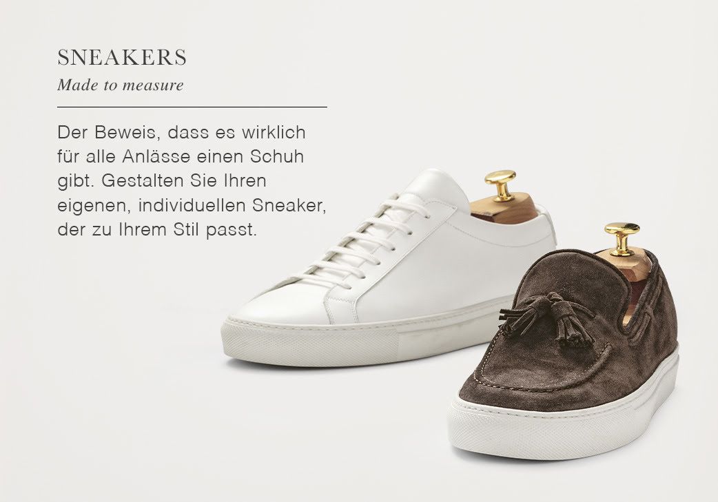 Erst Sneaker machen eine Garderobe komplett. Bestellen Sie unsere maßgefertigten Freizeitschuhe mit Optionen für einen individuellen Look. Wählen Sie einen Kontrast für Hinterkappe oder Zunge, je nach Geschmack aus Leder oder Wildleder. Monogramme runden jede Individualisierung ab. Das Sneakerleder kann zudem auf den Gürtel abgestimmt werden.